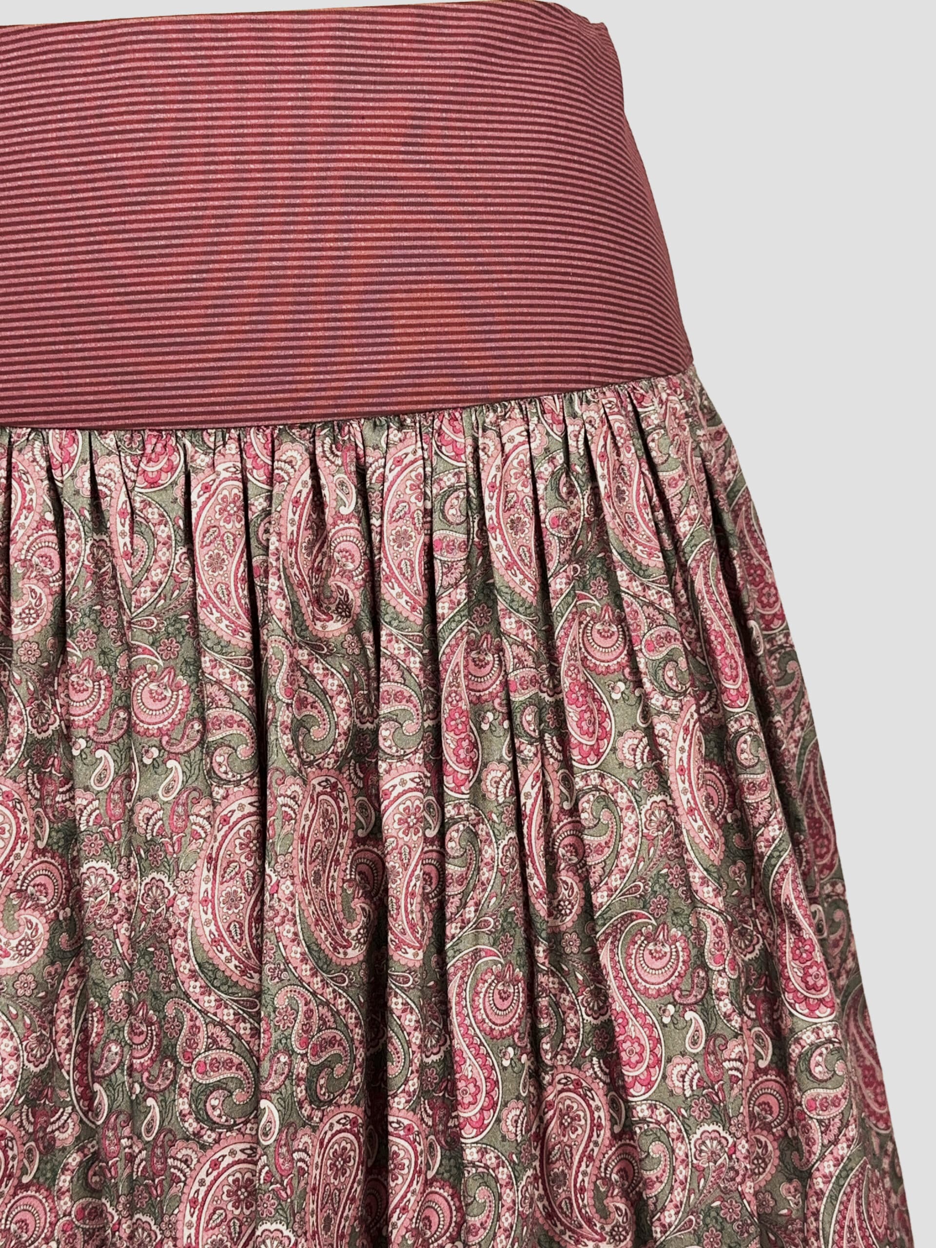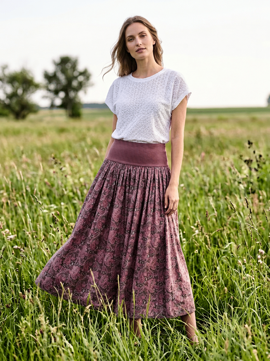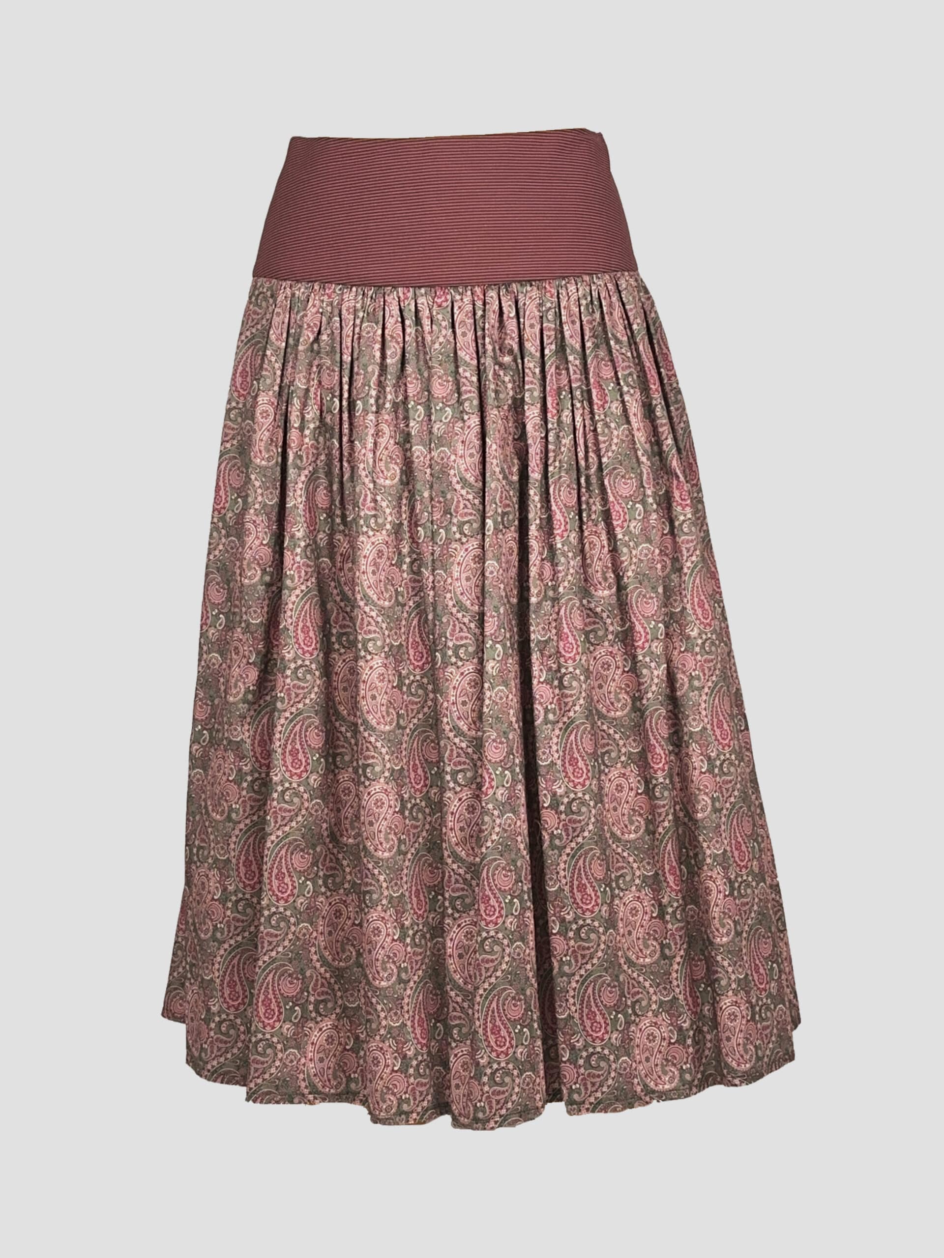 Der Rock fällt als midi-langer Tellerrock mit vielen feinen Falten, die eine schwingende Weite erzeugen – ideal für Feste oder auch im Alltag. Der breite elastische Bund in dunklem Rot sitzt bequem hoch am Bund und sorgt für perfekten Halt ohne zu drücken.